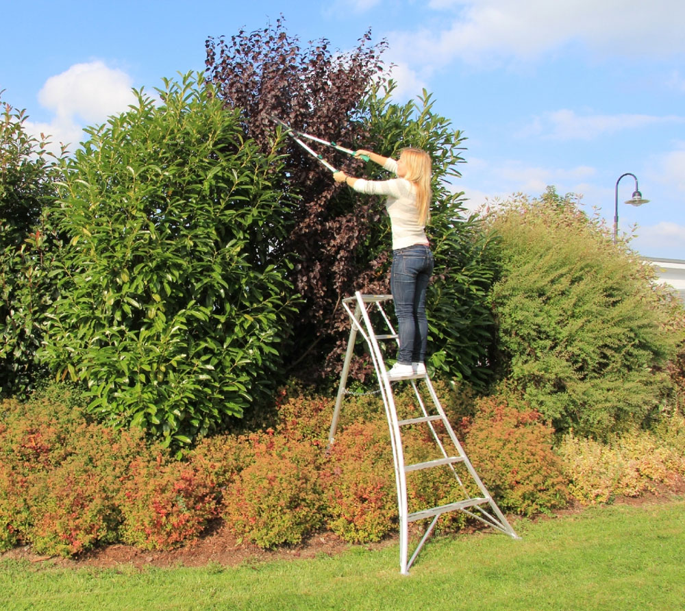 Praktische Alu-Leiter im attraktiven Design zur gezielten Verwendung in Hanglagen und zum sicheren Bearbeiten von Hecken und Bäumen. Ob Formschnitte, Baum- oder Treppenarbeiten; durch das sowohl in der Höhe als auch in der Tiefe verstellbare dritte Standbein ist die Leiter äußerst flexibel und vielseitig verwendbar (auch als Anlegeleiter). Zum perfekten Ausgleich von Unebenheiten im Gelände oder für nahe und direkte Arbeiten am Stamm bestens geeignet.Die breite Basis sowie die tiefen Doppelsprossen mit Anti-Rutsch-Riffelung sorgen für sicheren und bequemen Stand in jeder Lage.